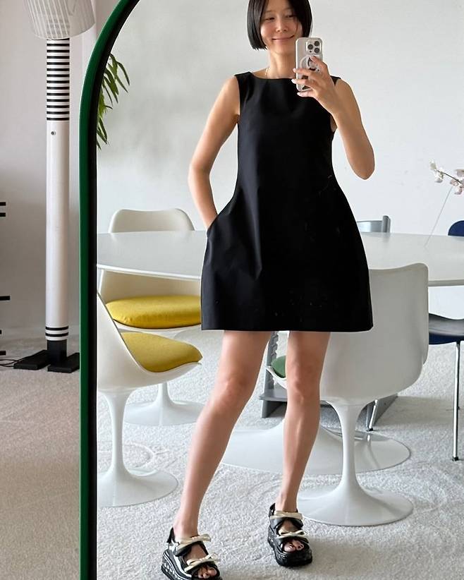 또 다른 사진에서는 A라인의 블랙 민소매 미니드레스를 선택, 볼드한 벨크로 샌들로 포인트를 준 심플 시크한 룩을 선보였다. 전체적인 톤은 차분하지만 존재감 있는 슈즈 선택으로 감각적인 룩을 완성한 것이 특징이다.