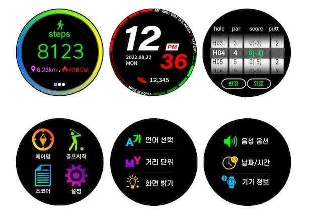 골프장 밖에서는 스마트 워치처럼 사용할 수 있습니다. 일상 모드로 설정하면 걸음 수, 이동 거리, 소모한 칼로리까지 확인할 수 있죠. 시계 화면을 2초 이상 누르면 배경을 변경할 수 있어 색다른 연출을 할 수 있습니다.