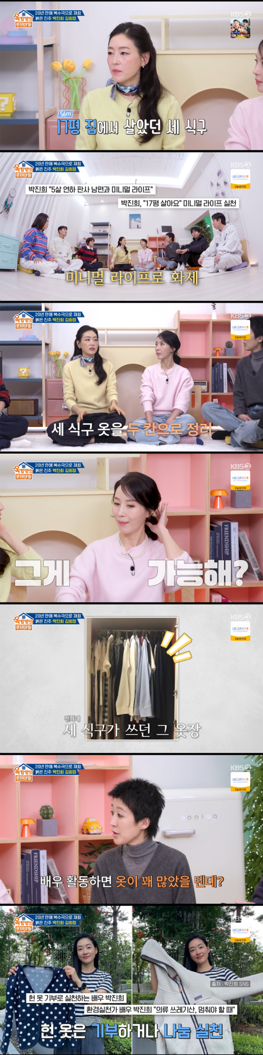 박진희는 과거 세 식구가 17평 공간에서 거주했던 시절을 언급했다. 특히 모두를 경악하게 한 것은 수납 공간의 규모였다. 박진희는 “세 식구의 옷이 옷장 단 두 칸에만 있었다”고 고백했다. 배우라 옷이 많았을텐데라는 궁금증에 “헌 옷은 기부하고 나눔을 했다"고 말해 눈길을 끌었다.
