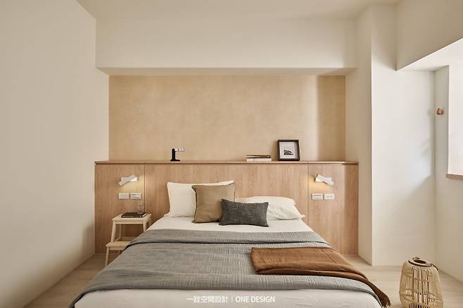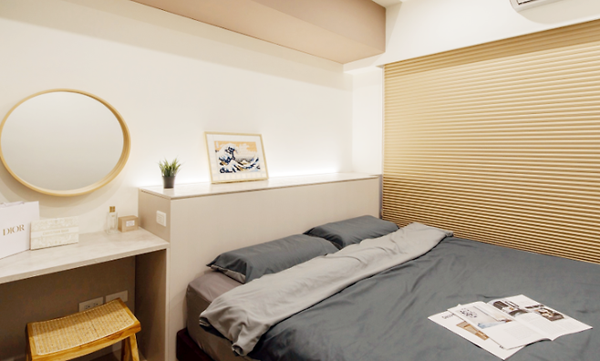 이번 화이트 우드 침실인테리어에서 주목할 만한 포인트는 수납기능이 있는 선반형 헤드보드입니다. 기존의 헤드보드와는 다르게, 상단에 디스플레이 선반이 마련되어 있어 독서용품이나 장식품을 진열할 수 있으며, 내측에는 보이지 않는 보관공간이 구성되어 있습니다.