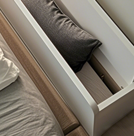 침실꾸미기 과정에서 놓치기 쉬운 세밀한 수납 요소들을 빠트리지 않고 반영한 부분입니다. 화이트우드인테리어의 깔끔한 선형미와 조화를 이루면서도, 기능성을 높여주는 현명한 설계라고 볼 수 있습니다.