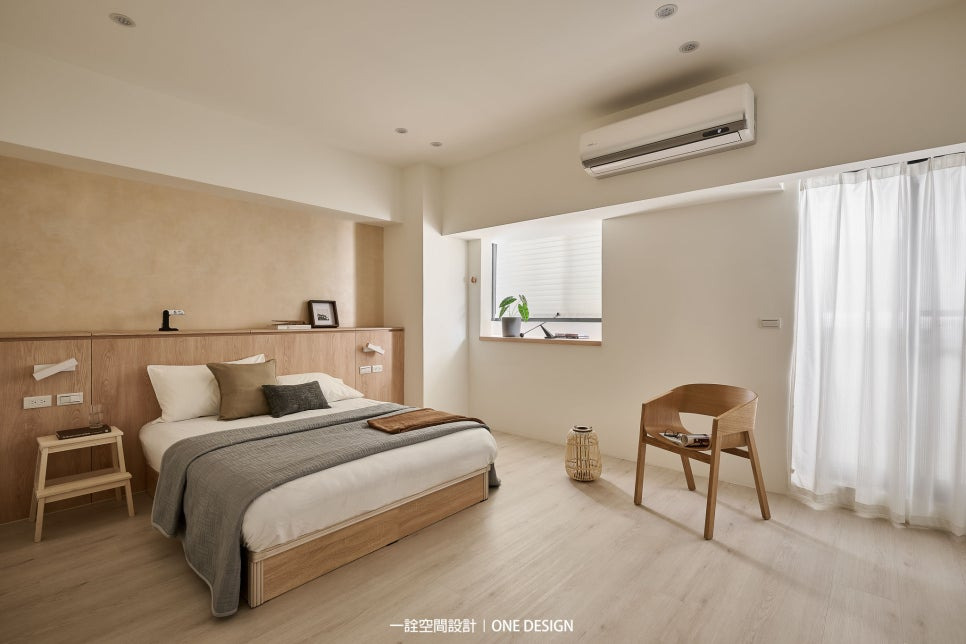 침실 디자인은 미니멀함을 중심으로 하되, 필수 가구들만 선별해 배치하여 공간의 여유로움을 극대화했습니다. 잠자리와 체어, 소형 사이드테이블만을 설치해 가구의 점유율을 낮추고, 대신 채광과 공기 순환을 위한 공간을 충분히 확보했습니다. 이러한 침실가구 레이아웃이 만들어내는 개방적인 공간감은 일상의 스트레스를 해소시켜줍니다.