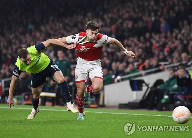영국 런던 에미레이트 스타디움에서 열린 2022-2023시즌 유럽축구연맹(UEFA) 유로파리그(UEL) A조 6차전에서 취리히(스위스)의 니콜라 보라니야셰비치(왼쪽)가 볼을 다투다가 아스날(영국) 키어런 티어니의 유니폼을 찢고 있다.