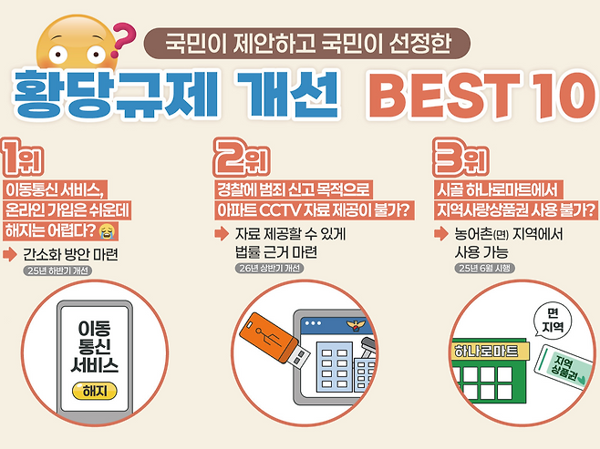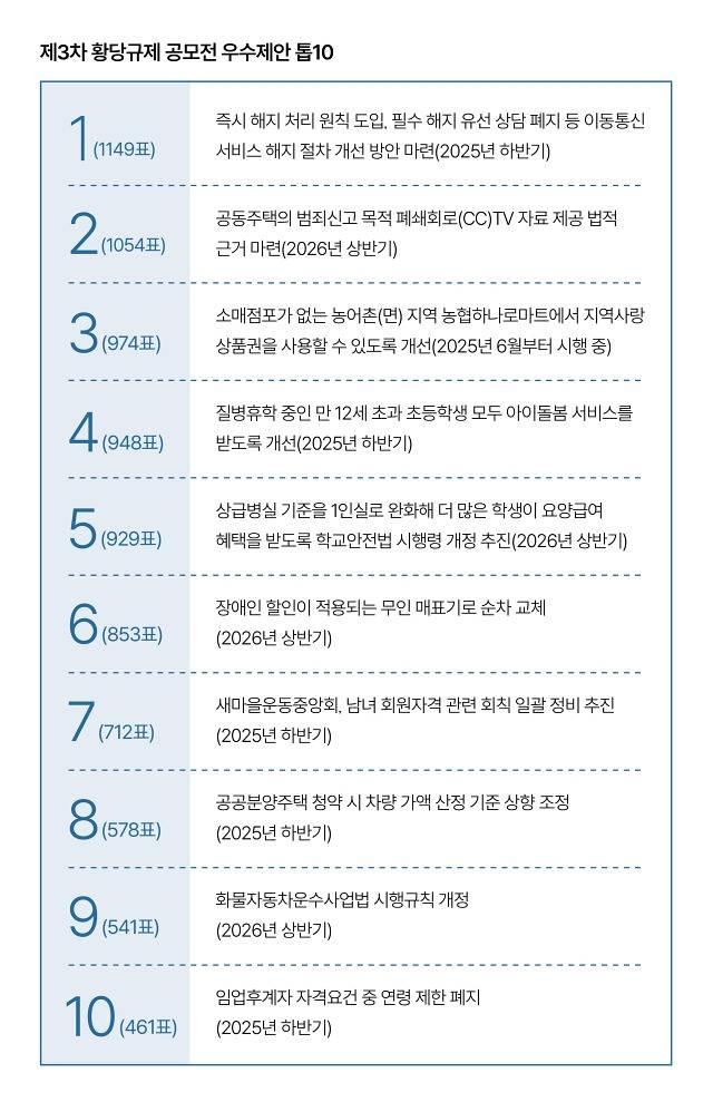 정부가 ‘제3차 황당규제 공모전’ 결과를 발표했습니다. 이동통신 서비스 해지 절차 간소화, 아동돌봄 서비스 대상 확대, 아파트 CCTV 제공 법적 근거 마련 등 총 51건의 규제가 개선됩니다. 상급병실 기준 완화, 장애인 할인 무인 매표기 확대, 친환경차 청약 불이익 해소 등 생활 밀착형 개선책도 포함됐습니다. 자세한 내용은 정책주간지 'K-공감'을 확인하세요.