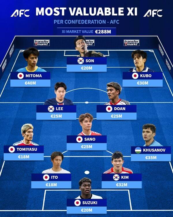 반면 일본은 스즈키 자이온(파르마 칼초 1913·2,000만 유로), 이토 히로키(FC 바이에른 뮌헨), 토미야스 타케히로(이상 1,800만 유로), 사노 카이슈(1. FSV 마인츠 05), 도안 리츠(아인트라흐트 프랑크푸르트·이상 2,500만 유로), 미토마 카오루(브라이턴 앤 호브 앨비언 FC·4,000만 유로), 쿠보 다케후사(레알 소시에다드·3,000만 유로) 등 7명이 아시아 베스트11에 자리했다.