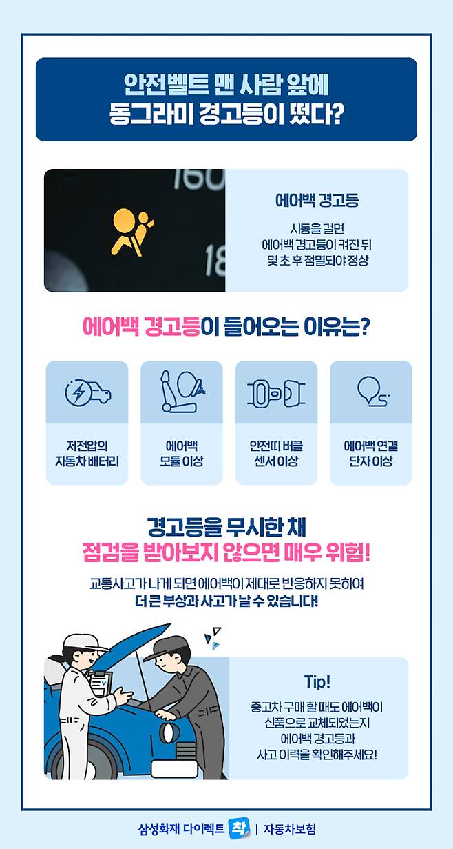 이 때문에 중고차를 구매할 때도 에어백이 신품으로 교체가 되었는지 확인하기 위해 에어백 경고등과 사고 이력 등을 확인해두는 것이 매우 안전합니다.