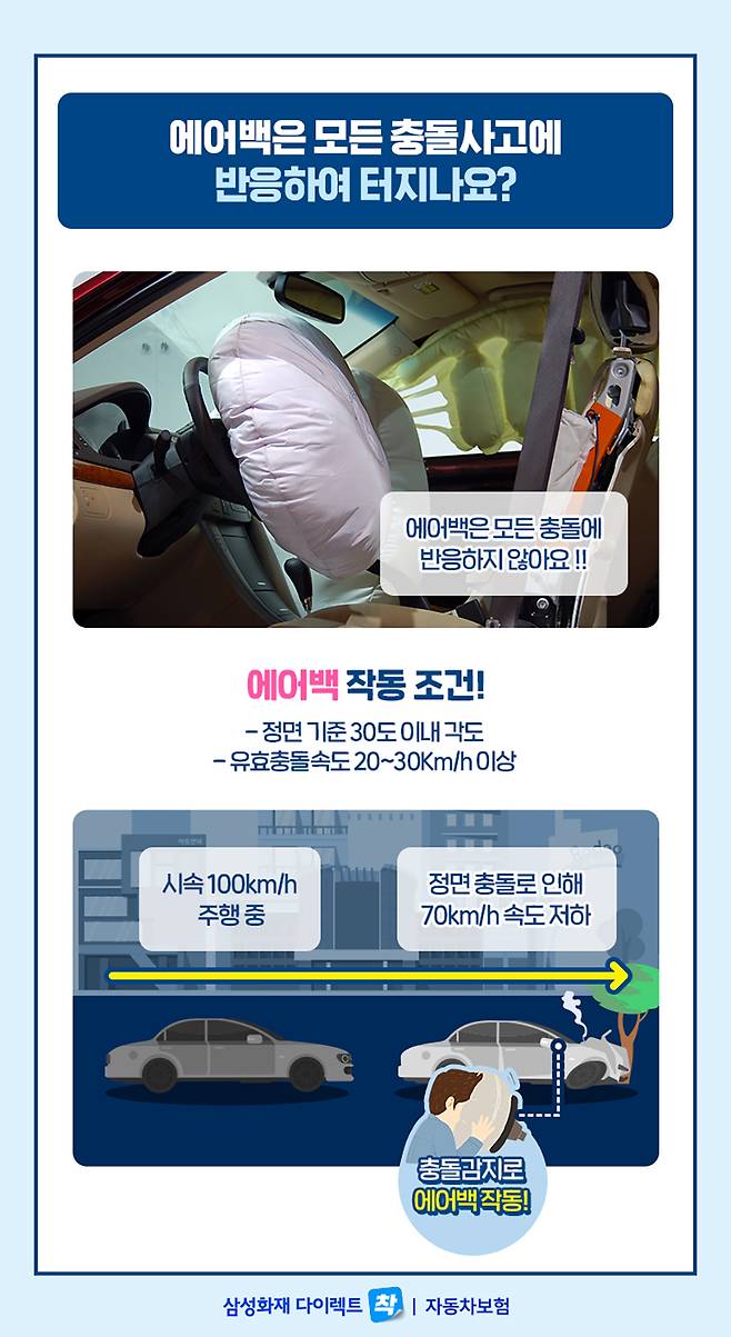 에어백 작동 조건은 ‘정면 기준 30 이내 각도’에서 ‘유효 충돌속도가 20~30km/h 이상’ 될 때인데요. 예를 들자면 시속 100km/h로 달리던 차가 정면충돌로 인해 70km/h로 속도가 저하가 되어 유효 충돌 속도가 30km/h가 넘는 순간에 충돌 감지가 되어 에어백이 작동하게 됩니다.