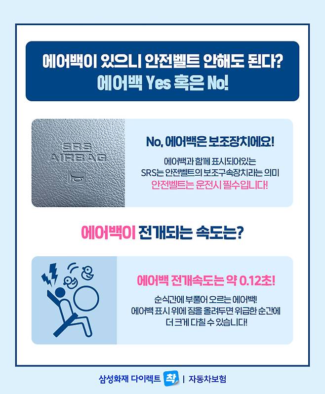 교통사고로부터 위급 시 내 생명을 책임져주는 건 안전벨트, 보조수단은 에어백인 것을 인지한다면 더욱 안전한 운전이 되겠죠?