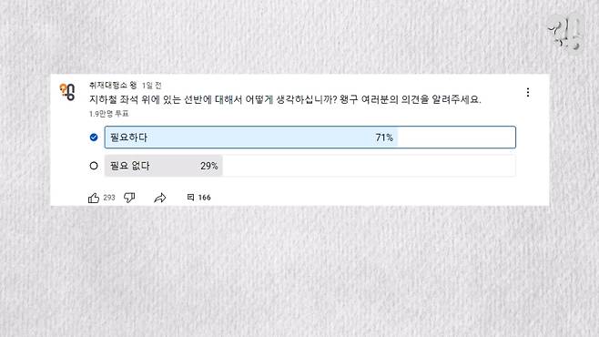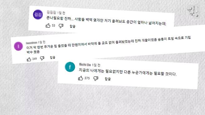 그런데 해외에서 선반 안 쓴다고 우리까지 없애야 하나? 왱 커뮤니티 설문조사 댓글을 보니 필요하다는 입장에서는 ‘사람들 백팩 몇 개만 올려놔도 공간이 넓어진다’거나 ‘무거운 짐을 들었을 때 올려놔보니 개꿀이었다’ 같은 반응이 많았다. ‘지금 나한테는 필요 없지만 다른 누군가에게는 필요할 것’이란 댓글도 많은 공감을 받았다. 물론 필요없다는 입장에서는 ‘짐 내릴 때 무게 주체못해서 앉은 사람 다친다’ ‘실제로는 선반에 가방 몇 개 안보인다’는 댓글도 있었다.