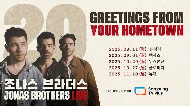 [엠투데이 이정근기자] 삼성전자가 11일 삼성 TV 플러스를 통해 세계적인 팝 밴드 조나스 브라더스(Jonas Brothers)의 데뷔 20주년 기념 콘서트 'JONAS 20: Greetings from Your Hometown' 투어를 독점 생중계한다.