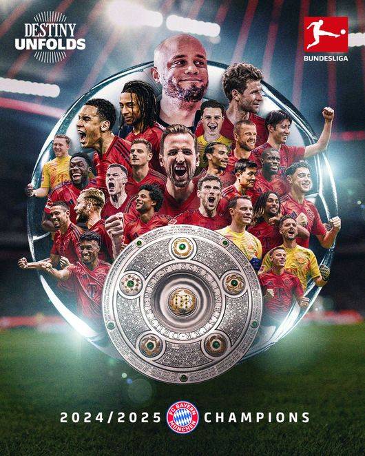 바이에른은 5일(이하 한국시간) 구단 홈페이지를 통해 "바이에른은 2024-2025시즌 챔피언이다! 바이에른이 다시 한번 독일 챔피언이 됐다! 레버쿠젠은 일요일 프라이부르크와 무승부를 기록한 뒤 더 이상 분데스리가 정상에 오를 수 없게 됐다. 바이에른이 독일 챔피언이 된 건 34번째이며 훌륭한 시즌에 대한 보상"이라고 발표했다.