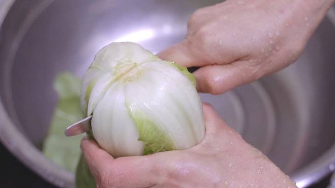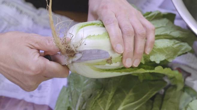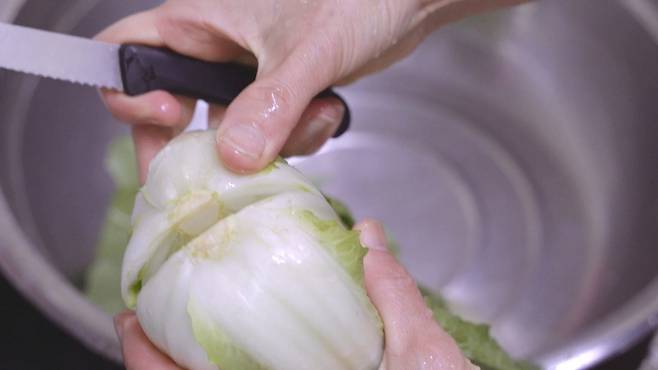 깨끗이 씻은 배추는 뿌리 부분에 칼집을 적당하게 넣어 주세요. 이렇게 칼집을 넣어야 배추가 잘 절여진답니다.