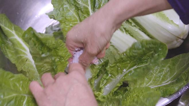 배추 사이에 천일염을 켜켜이 잘 뿌려 놓으세요. 그리고 총 1시간 20분 동안 잘 절여 주세요.