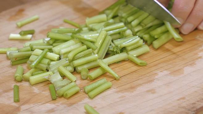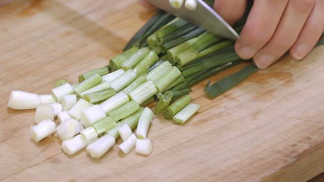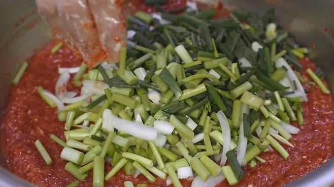 섞어 놓은 양념장에 미나리, 쪽파를 넣고 잘 섞으세요. 섞은 후에는 반드시 30분 이상 숙성시켜 사용하세요. 그래야 맛이 더욱 잘 나온답니다.