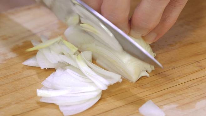배추가 절여지는 동안 양념장과 재료 손질을 하세요. 쪽파, 미나리는 송송 잘 썰어 주세요. 그리고 양파 반 개는 반으로 썰어 채 썰어 준비하세요.