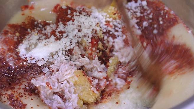 이제 양푼에 갈아 놓은 것과 찹쌀풀, 새우젓, 멸치액젓, 다진 마늘, 생강, 매실청, 설탕, 소금, 고춧가루를 넣고 잘 섞어 주세요.