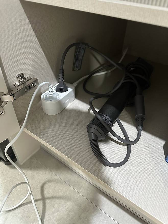 사진은 좀 지저분하지만 이렇게 드라이기를 장 안에 두고 쓸 수 있어 화장대 위에 늘 올려져 있던 드라이기는 싹 정리되었어요.