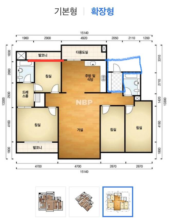 빨간색 라인은 저희가 들어왔을 때 확장되어 있었구요, 파란색 칸은 저희 집은 현관이 ㄱ자 형태로 빠져 있었어요.