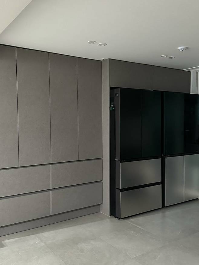 주방의 가장 큰 고민! 주방 설계할 때 뚱냉인 냉장고를 어디에 놓을 것인 지에 대해 많이 고민했던 것 같아요. 저희 집은 4도어 냉장고 한 개, 4도어 김치냉장고 1개라 공간이 많이 필요했어요.