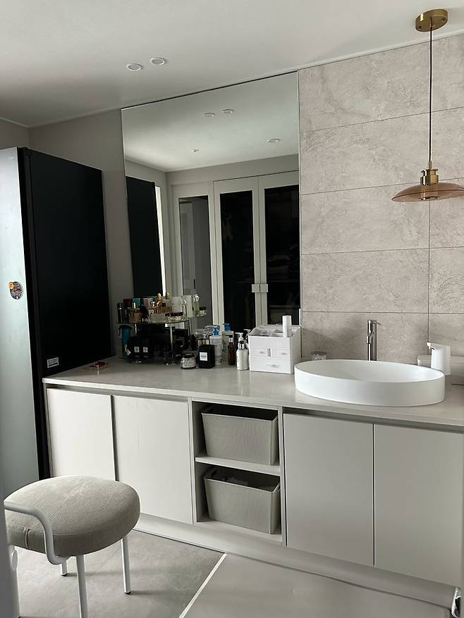 2개나 설비작업을 해야 했지만 예산 걱정을 하는 과정에서 포기 해야하나 싶기도 했지만 남편이 제 꿈을 실현시켜주었답니다. 파우더룸의 화장대는 서서 할 수 있는 높이와 앉아서 할 수 있는 높이 중 저는 앉아서 할 수 있는 높이로 설계했어요.