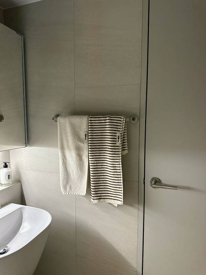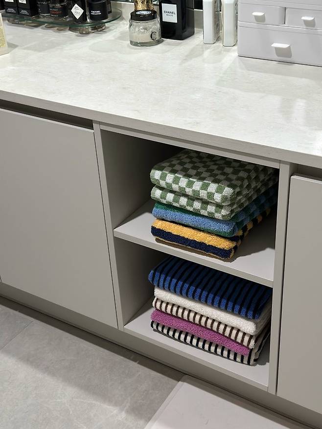 오픈되어 있는 걸 별로 좋아하지 않는 저지만 재미를 위해 파우더룸은 오픈으로 해봤어요. 수건을 두기도 하고 바스켓을 두기도 하는데 수건을 쌓아놓으니 너무 예쁘지 않나요?