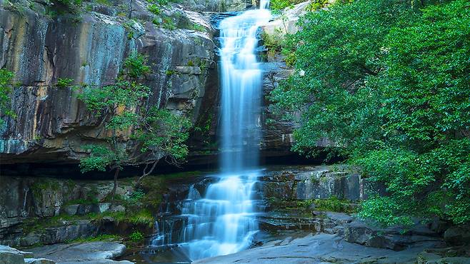 각 단마다 굴곡진 절벽과 만나면서 물길이 거칠게 회오리치고, 그 아래에는 두 개의 깊은 소(沼)가 생겨나 자연이 빚어낸 입체적인 수경을 완성한다.