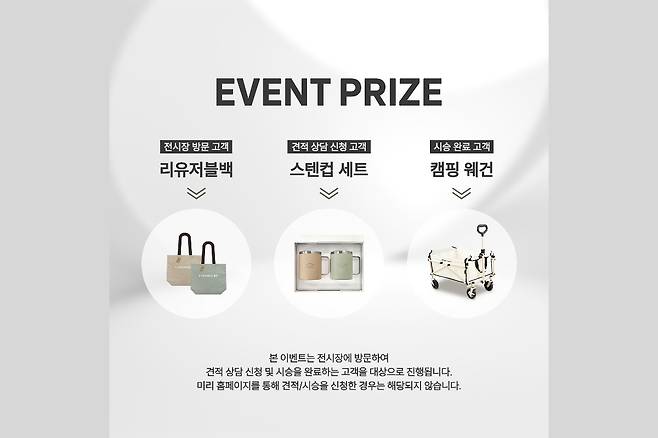 다만, 모든 경품은 전시장 별로 선착순 조기 마감될 수 있으며, 고객이 전시장을 방문하면 리유저블백을, 견적 상담을 신청하면 스텐컵 세트를, 마지막으로 차량 시승까지 완료하면 캠핑 왜건을 각각 증정한다.