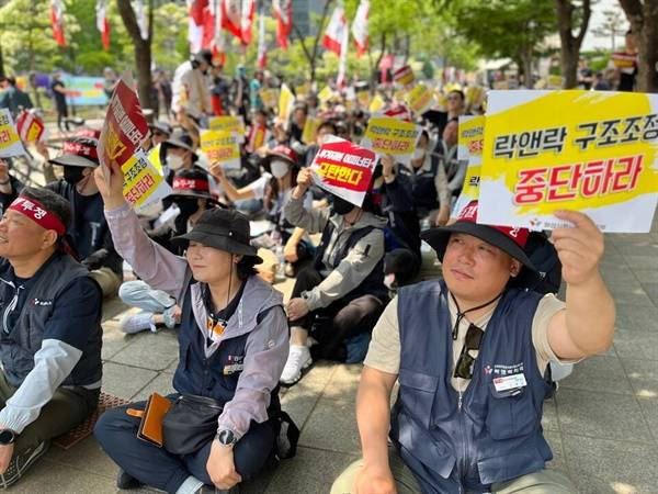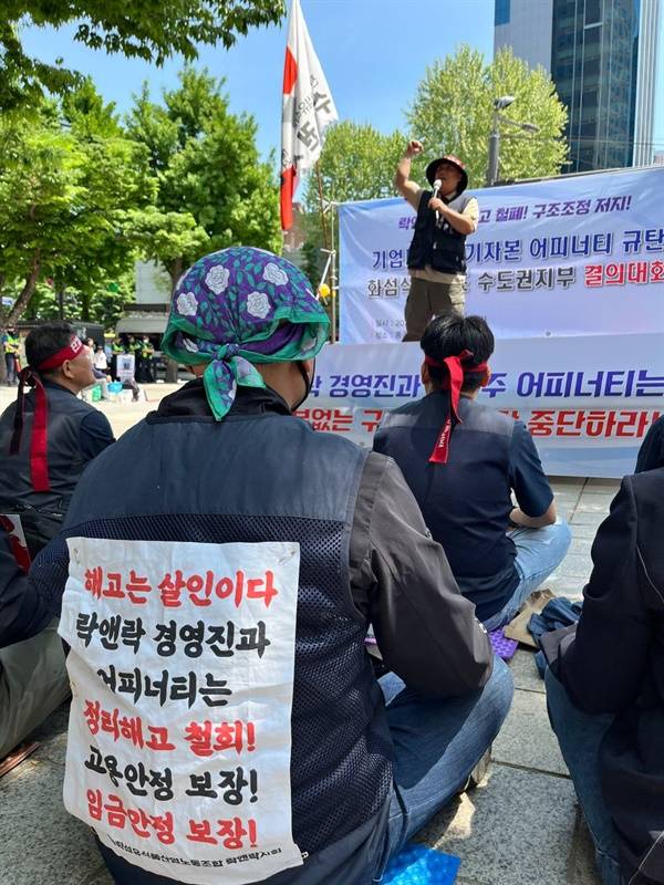 | ▲ "락앤락 구조조정 중단하라" "투기자본 어피너티 규탄한다" 손피켓을 흔드는 결의대회 참가자들 |