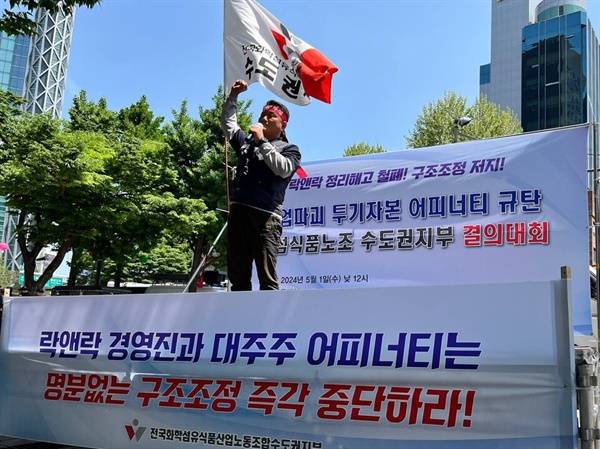 화섬식품노조 수도권지부가 1일 낮 12시 종각역 어피너티에쿼티파트너스(어피너티) 앞에서 '락앤락 정리해고 철폐! 구조조정 저지! 기업파괴 투기자본 어피너티 규탄 결의대회'를 열고 "락앤락 경영진과 대주주 어피너티는 명분 없는 구조조정 즉각 중단하라"라고 요구했다.