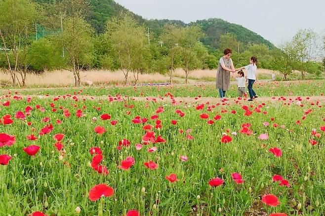 강원도 양구군 양구읍 하리 570-1에 위치한 양구 꽃섬은 계절마다 다른 꽃이 피는데 이맘 때에는 양귀비와 장미가 핀다.