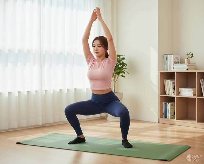 먼저, 다리를 어깨 넓이의 두 배로 벌리고 발끝은 45도 바깥쪽을 향하도록 선다. 이 상태에서 일반 스쿼트처럼 엉덩이를 내리며 앉는다.