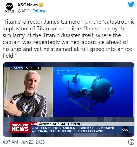 심해로 내려가 타이타닉을 33번이나 직접 방문했던 카메론 감독은 이날 ABC뉴스와 인터뷰에서 “커뮤니티의 사람들은 이 잠수함에 대해 매우 우려했다”고 운을 뗐다.