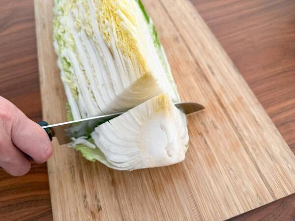 배추를 세로로 반 갈라 밑동(뿌리 부분)을 넉넉히 잘라냅니다.