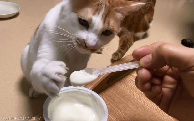 하지만 요거트는 녀석의 취향이 아니었나 보다. 당장 치우라는 듯 앞발을 들어 냥냥펀치를 날리는데. 이 '불쾌한 액체'에 발이 닿을까 싶어 때리는 시늉만 하는 모습이 웃음을 자아낸다.