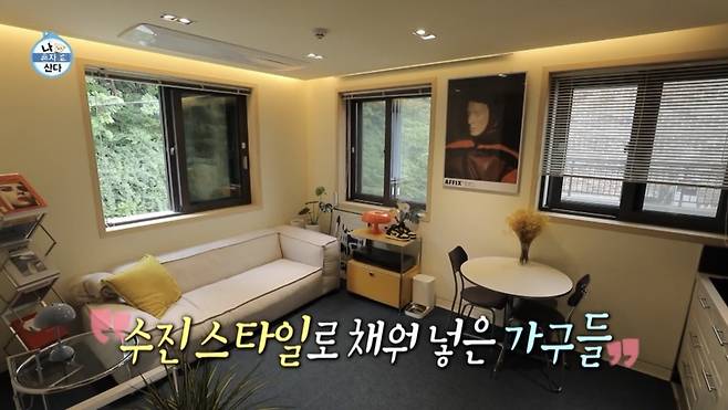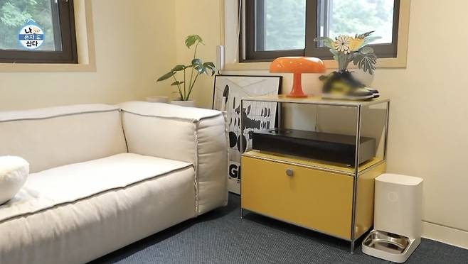 배우 경수진과 마찬가지로 전체적으로 깔끔한 모노 톤을 유지하면서 작은 테이블, 의자 같은 가구는 원색으로 배치했다. 서랍 위에는 색감이 쨍한 식물을 뒀다. 스탠드 조명과 벽에 세워둔 포인트 액자도 눈에 띈다.