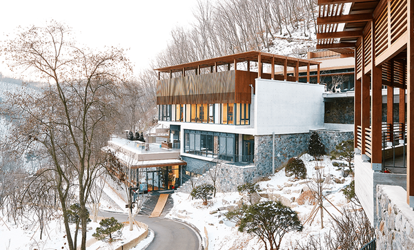 겨울의 차가운 공기를 가로지르며 산책로를 따라 걸으면 눈 덮인 주변 풍경과 현대적인 건축물이 이루는 대비가 압도적입니다. 이곳의 명상관에서는 자연 속에서 내면을 들여다보는 시간을 가질 수 있어 휴식의 질을 한층 더 높입니다.