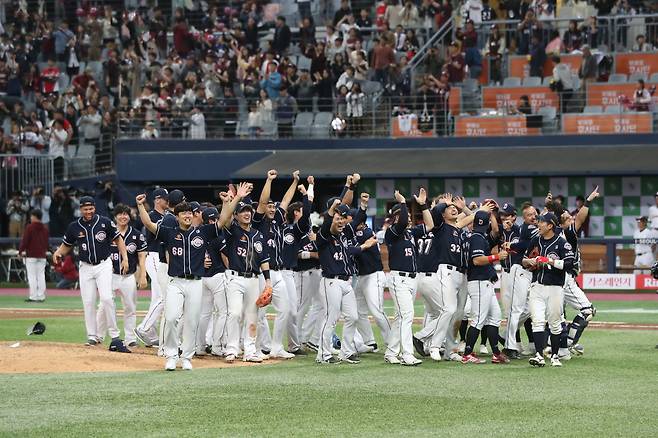 | ▲ 2019 한국시리즈 우승은 두산 26일 오후 서울 구로구 고척스카이돔에서 열린 2019 프로야구 한국시리즈 4차전 키움 히어로즈와의 경기에서 승리해 우승을 차지한 두산 베어스 선수들이 기뻐하고 있다. |