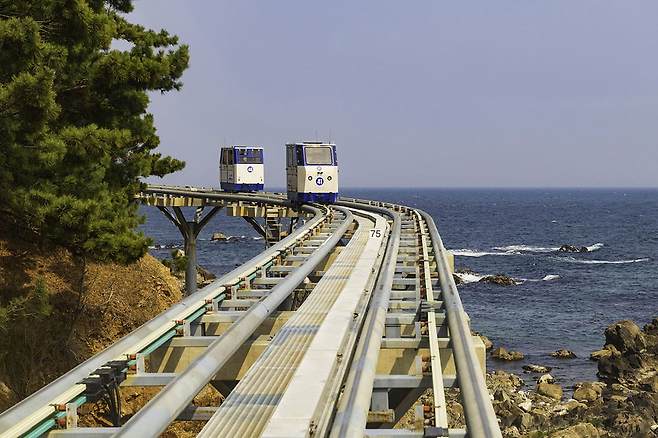죽변해안스카이레일은 울진의 푸른 바다를 가장 가까이서 볼 수 있습니다. 자동으로 죽변항부터 후정해변까지 일정한 속도로 달리며 파란 파도가 하얀 포말이 되어 부서지는 천혜의 광경을 목격할 수 있습니다.