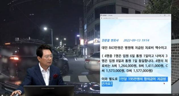 한 변호사가 대리운전 기사에게 전달받은 내역에 따르면 "4명 중 한명은 6일 입원하고 1일 통원 치료했으며 나머지 3명은 입원 8일과 통원 1일 치료를 받았다"면서 "4명의 치료비는 126만원, 141만원, 두 명은 157만원씩 지급됐다"고 전했다.