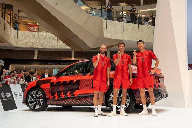 아우디코리아는 2일 여의도 IFC몰에서 열린 '아우디 써머투어 FC 바이에른 팬미팅'에서 김민재, 토마스 뮐러, 콘라드 라이머 선수가 아우디 써머투어를 기념한 스페셜 데칼 차량을 공개했다.