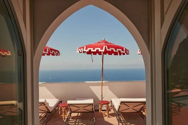 이탈리아 남부의 섬, 카프리섬 근처에 자리한 일 카프리 호텔의 컬러 포인트는 외관에서부터 드러난다. 파스텔 핑크로 채워진 건물은 영화 <그랜드 부다페스트 호텔>을 생각나게 한다. 외관의 컬러는 실내와 수영장 풀에도 유사하게 이어진다. 침대 헤드와 욕실 타일 등은 연한 분홍색으로, 루프 탑에는 진한 분홍색의 파라솔을 배치하여 깊이를 더했다. @ilcaprihotel