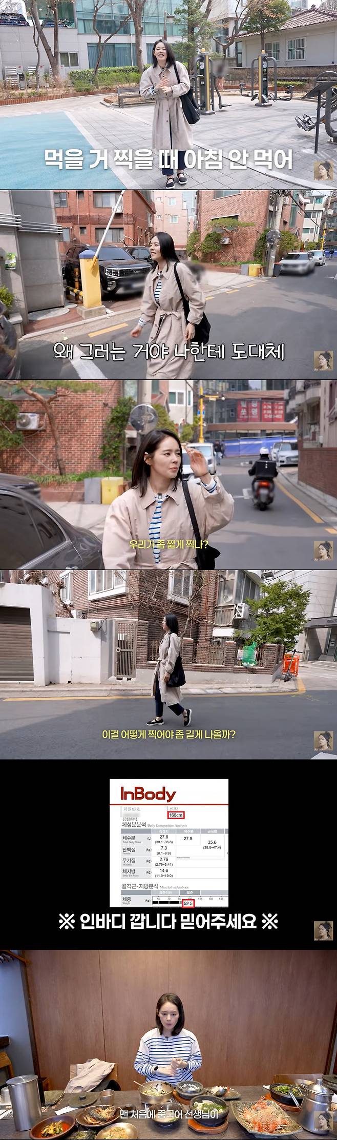 단화를 신고 신나게 뛰는 한가인의 풀샷을 찍던 제작진은 "어제 콘텐츠 나가고 '168cm처럼 안 보인다'는 얘기가 많더라"라고 밝혔다. 한가인의 다이어트 영상에서 키가 168cm이라는 사실이 공개됐는데, 이에 놀란 팬들이 많던 것.