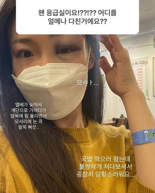 이아영은 9일 눈이 시퍼렇게 멍이 든 사진을 공개하고 "엘베가 늦어서 계단으로 가려다가 발목에 힘 풀리면서 모서리에 눈 콕, 발목 삐끗"이라며 "국밥 먹으러 왔는데 불쌍하게 쳐다보셔서 굉장히 당황스러워요"라고 밝혔다.