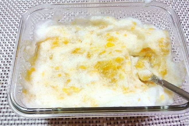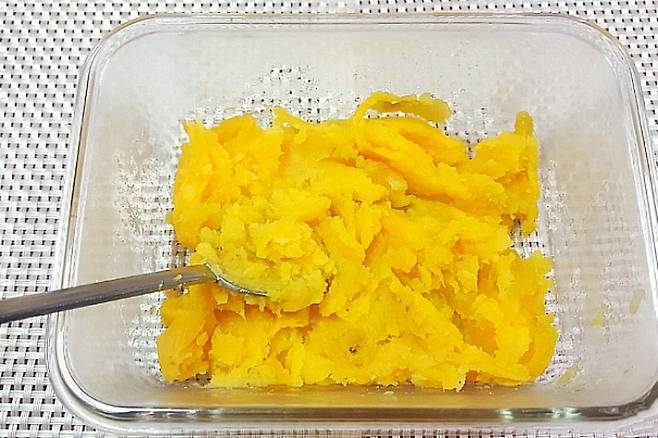 먼저 전자레인지 가능한 용기에 달콤한 고구마를 으깨줍니다. 고구마는 물렁물렁한 호박고구마를 사용하시면 좋습니다.