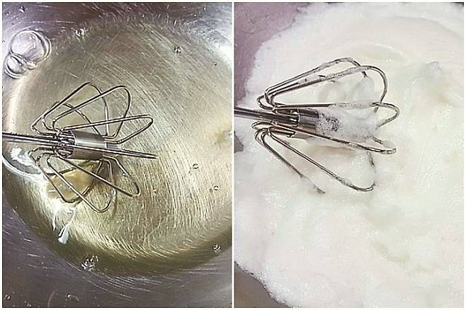 흰자는 넓은 볼에 머랭을 만들어 줍니다. 평소 달달한 것 좋아하시면 설탕 약간 섞어도 좋지만 건강과 다이어트를 위해서라면 이미 고구마도 달기 때문에 설탕을 빼시는 게 좋겠죠?