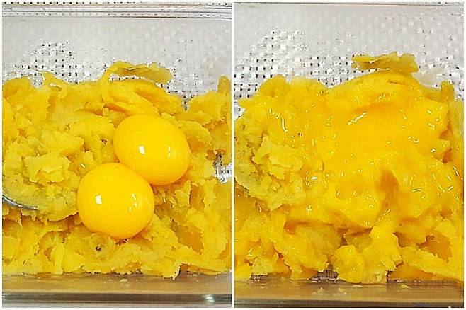 계란은 흰자와 노른자를 분리해 주시고요. 으깬 고구마에 노른자만 넣고 잘 섞어 줍니다. 소금 1꼬집도 같이 넣어요.