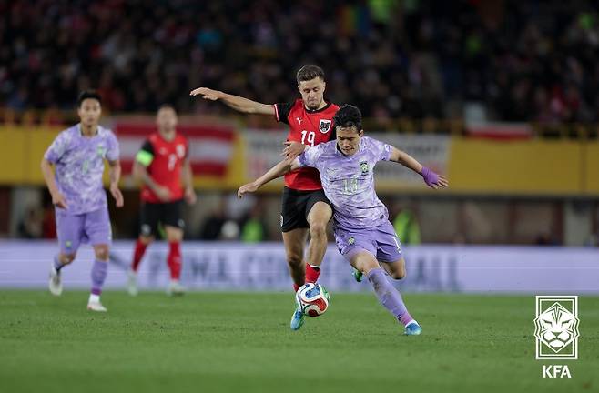 오스트리아전→ 김주성, 김민재, 이한범이 수비 라인을 구축하며 조직력은 다소 안정되었으나 빌드업이 문제였다. 후방에서 최전방으로 이어지는 루트가 차단되자 단순한 롱볼에 의존했고, 이는 손흥민의 고립을 가속화했다. 결국 자비처에게 허용한 결승골 역시 수비 전환 과정에서의 미숙함에서 비롯되었다.