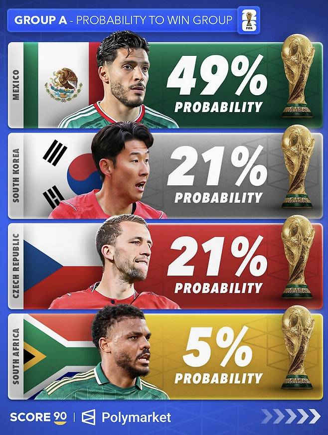 데이터가 가리키는 A조의 판세는 더욱 냉정하다. 멕시코(49%)가 압도적인 '1강'으로 군림하는 가운데, 한국은 체코와 함께 조 1위 확률 21%를 기록하며 '2중'으로 분류되었다. 남아프리카공화국(5%)이 '1 약'으로 처져 있지만, 지금의 경직된 시스템으로는 체코와의 동률을 깨고 조 1위라는 상한선을 뚫기 어렵다. 21%라는 숫자는 가능성이 아니라, 현재 한국 축구가 처한 전술적 정체기를 상징하는 지표다.