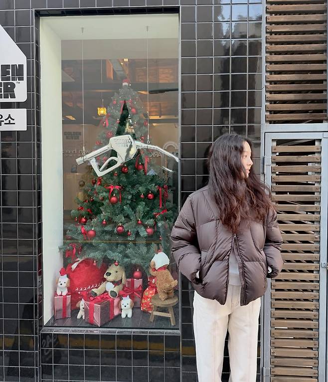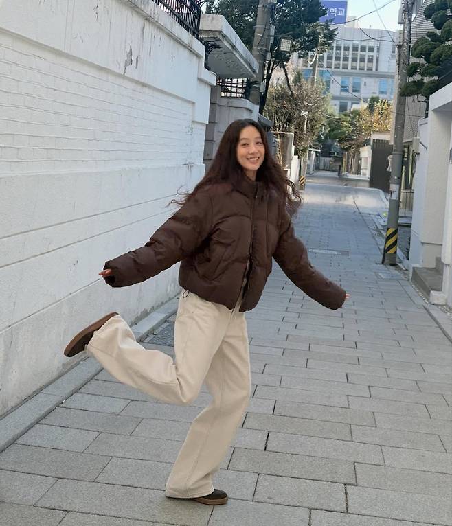 사진 속 정려원은 광택감이 도는 다크 브라운 컬러의 숏 패딩에 깨끗한 화이트 와이드 팬츠를 매치해, 편안하면서도 세련된 겨울 스타일링을 보여주고 있는데요.