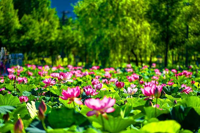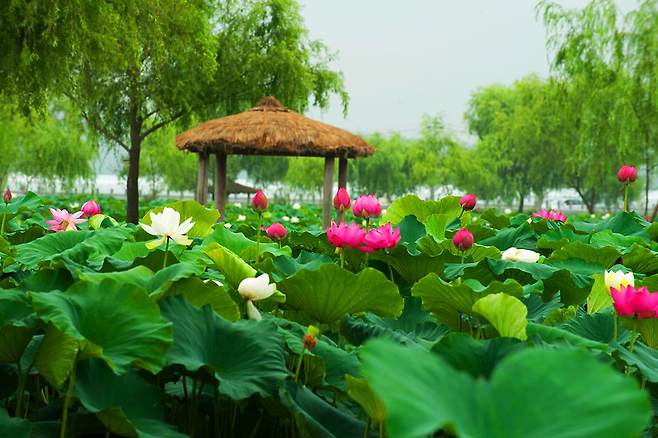 정자와 다리가 어우러진 정원 곳곳에서는 다양한 종류의 연꽃을 만날 수 있으며, 연꽃들은 6월부터 피기 시작해 10월까지 이어지는 장관을 연출합니다.